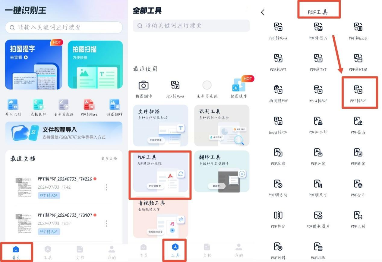 1. 打开“一键识别王”软件,在首页找到【工具】页面,然后选择“PDF工具”分类。