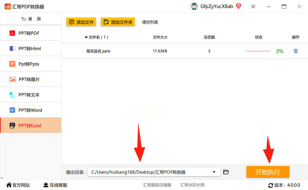 步骤二:在左侧功能列表中选择“PPT转Excel”,然后在右侧区域上传PPT文件,支持批量上传。