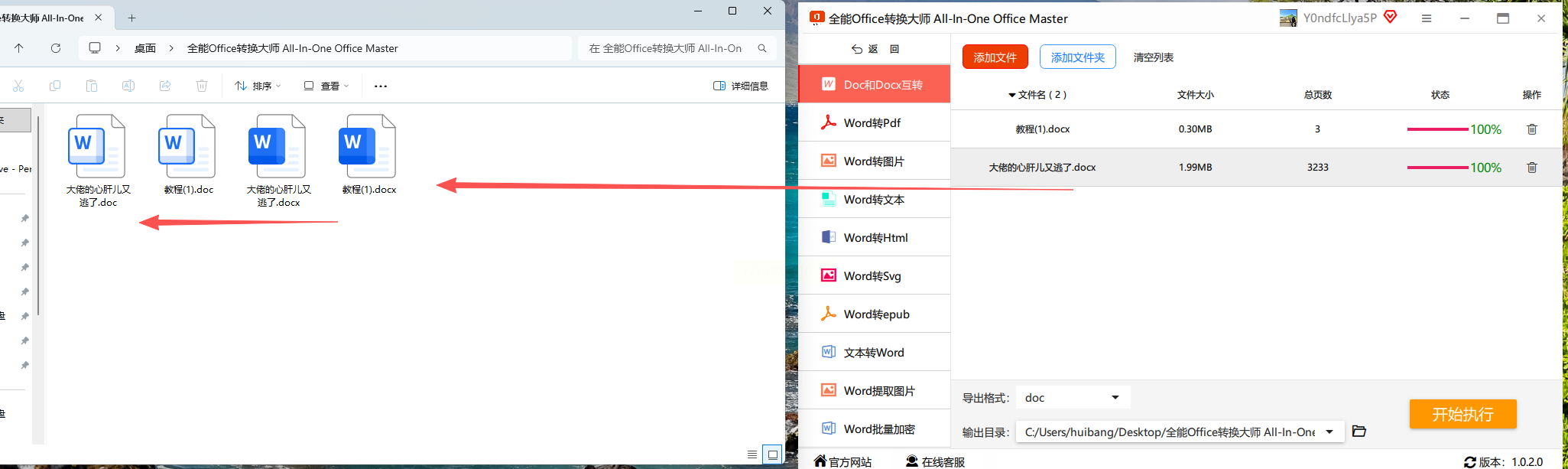 6. 开始转换:确认所有设置无误后,点击“开始执行”,稍等几秒(大文件最多1分钟),提示“转换成功”后,去保存路径就能找到doc文件,原docx文件会自动备份,不会被覆盖。