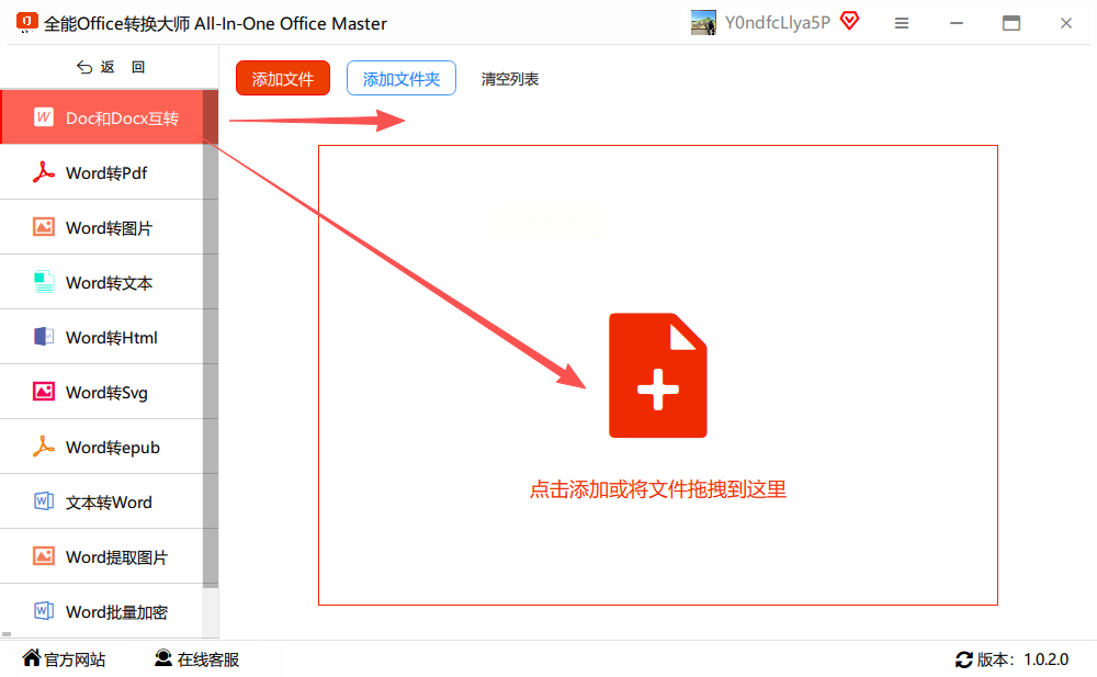 3. 导入文件:点击“添加文件”,选中要转换的docx文件,支持多选或拖放导入,批量处理docx转doc更高效。