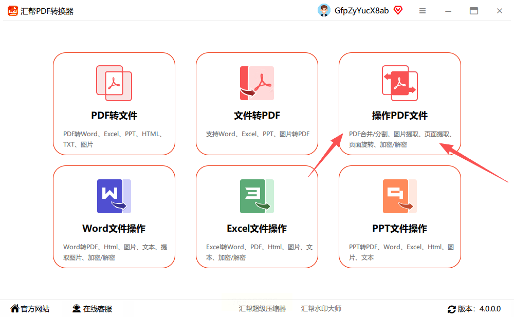 首先通过官网下载汇帮PDF转换器,安装完成后双击图标启动软件。进入主界面后,点击“操作PDF文件”选项,即可进入文件处理功能区。