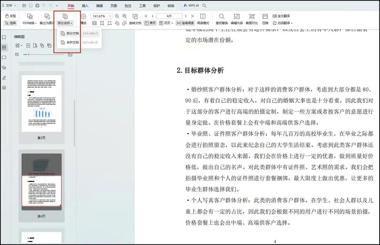 在顶部菜单栏找到“页面布局”选项卡,点击“更多操作”中的“拆分合并”,选择“拆分文档”功能。