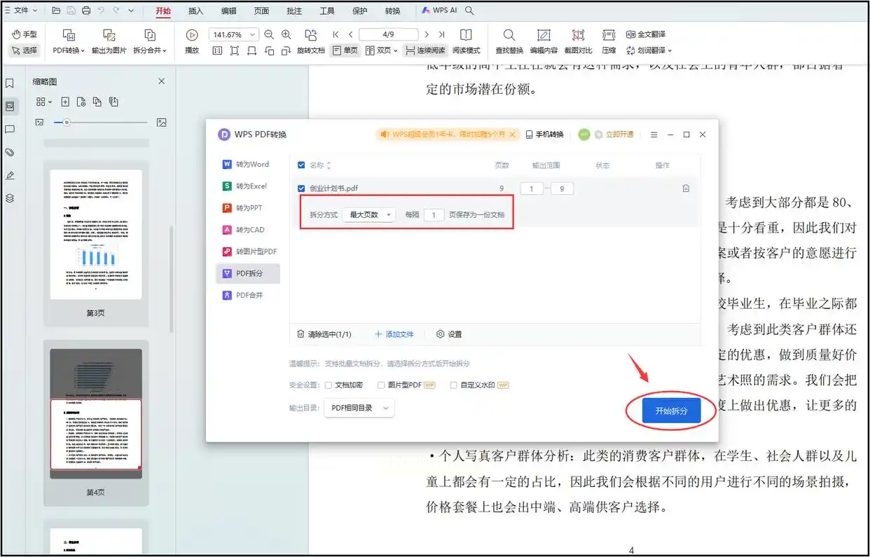 在文件预览区域,可通过勾选“页面缩略图”快速选择需要拆分的页面,支持单选、多选或全选。也可通过“页码范围”手动输入起始和结束页码。