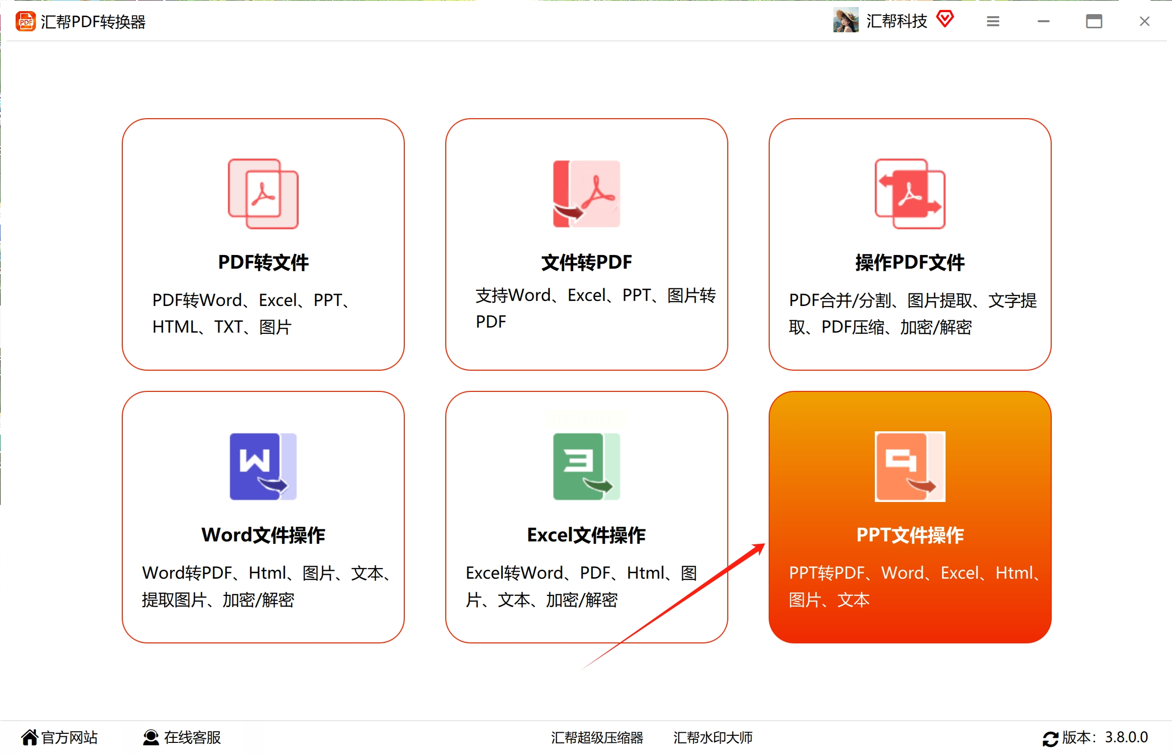 2. 在主界面中,找到“PPT相关操作”或“文件转换”分类,选择“PPT转PDF”功能