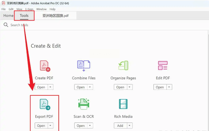 步骤二:点击右侧工具栏的“工具”面板,然后选择“导出PDF”功能。