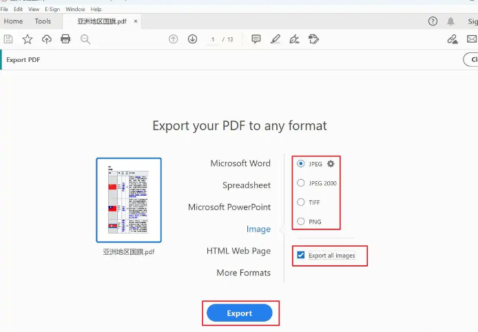 步骤三:在导出格式中,选择“图像”,然后根据你的需要,选择JPEG或PNG等图片格式。