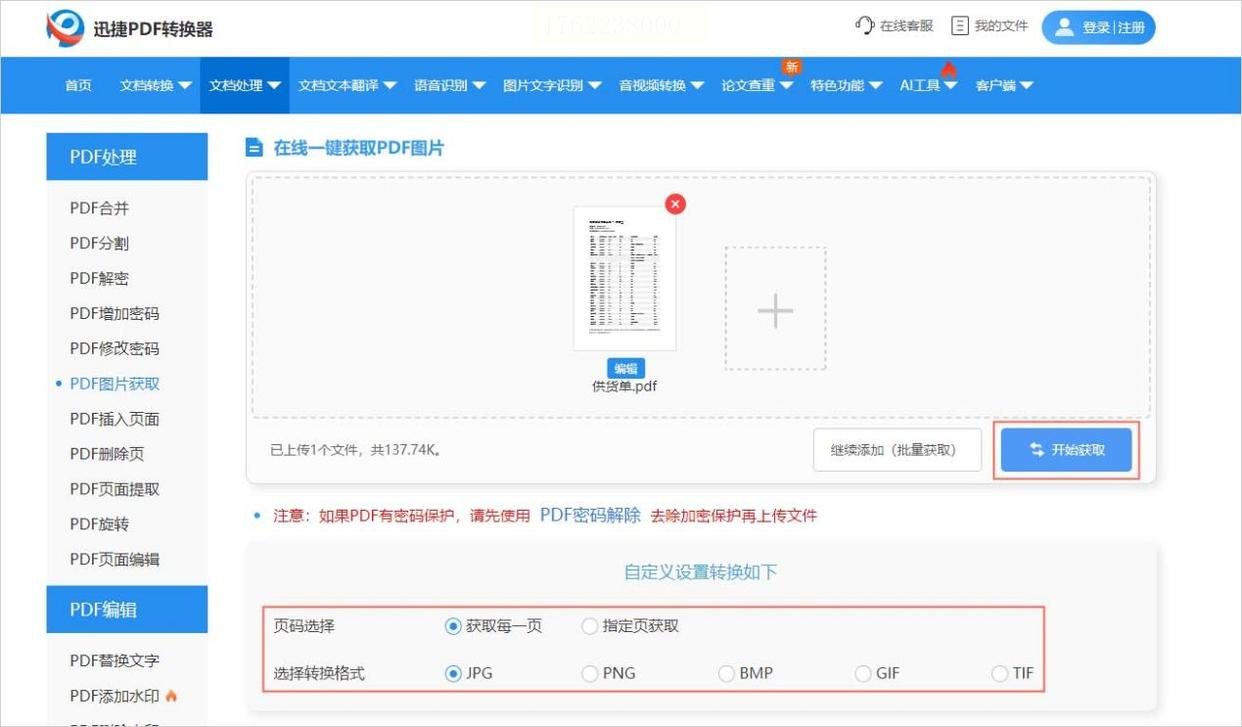 步骤一:访问迅捷PDF转换器的在线网站,在功能列表中找到“PDF处理”分类下的“PDF图片获取”功能。