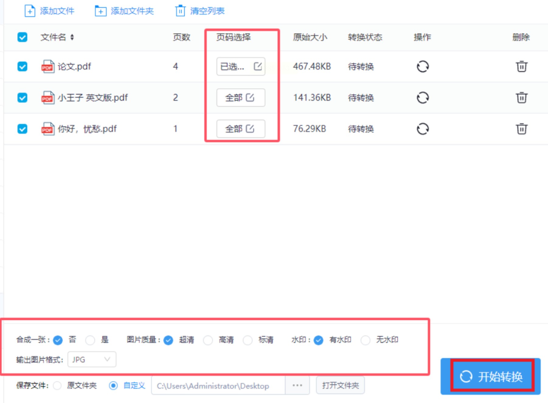 步骤二:上传单个或多个PDF文件,系统会自动识别页码和文件大小。