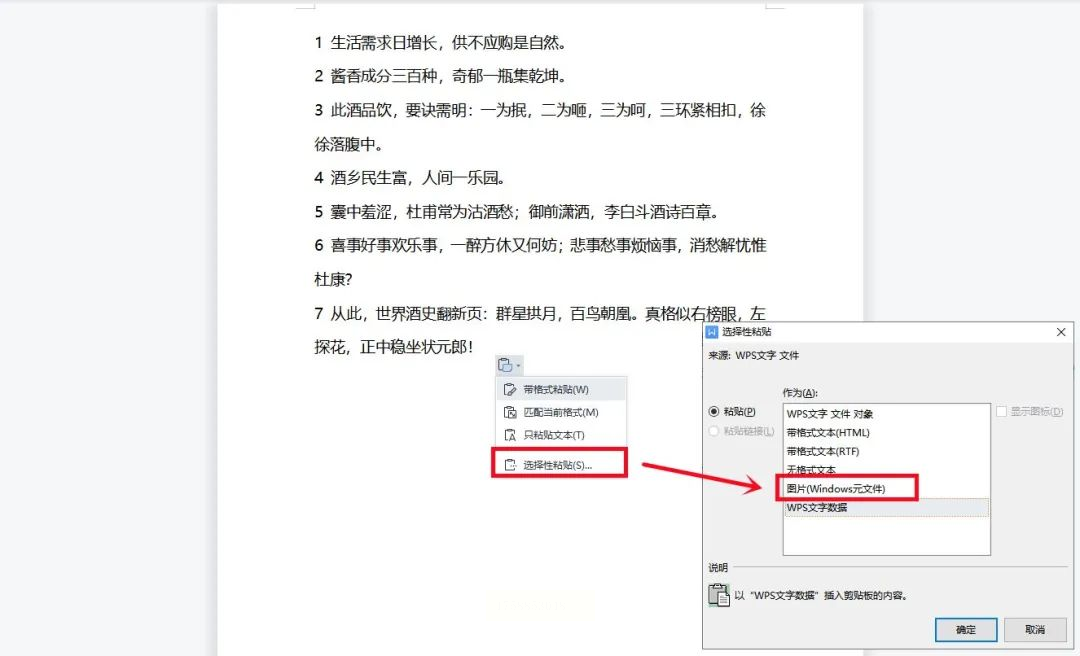 步骤二:新建Word文档,将内容粘贴至文档中。为确保格式稳定,可再次复制粘贴,并右键选择“选择性粘贴”中的“图片(Windows元文件)”选项。