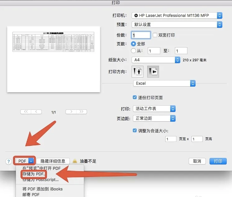 2. 选择“存储为PDF”:在打印窗口底部找到“PDF”按钮(在打印机设置下方),点击后选择“存储为PDF”。