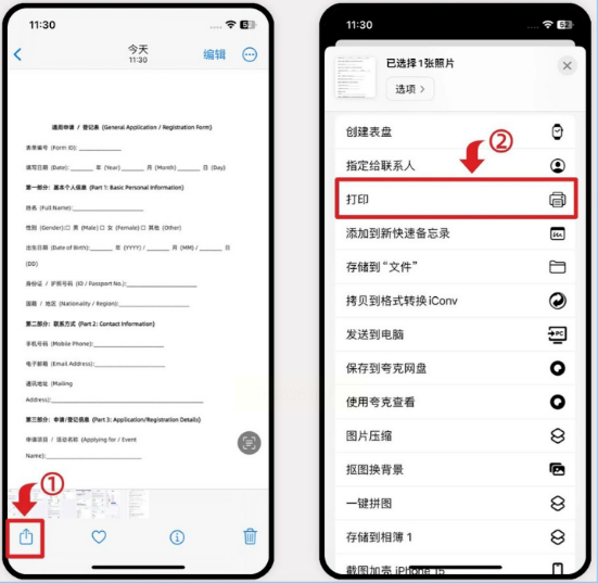 3. 点击左下角“分享”图标,在弹出的分享菜单中找到“打印”选项;