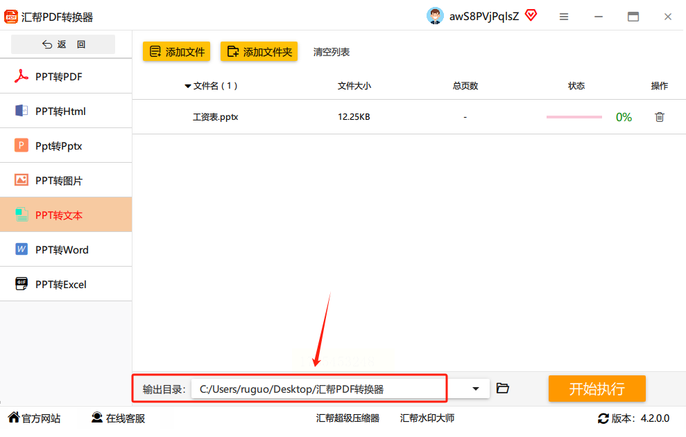 先找到电脑里的汇帮PDF转换器,双击打开。一进去你就会看到界面左边有一排功能选项,直接点“PPT文件操作”那个大按钮,进去后左边能看到“PPT转文本”“PPT转PDF”这些选项,咱们选“PPT转文本”,这个就是专门干这个的!