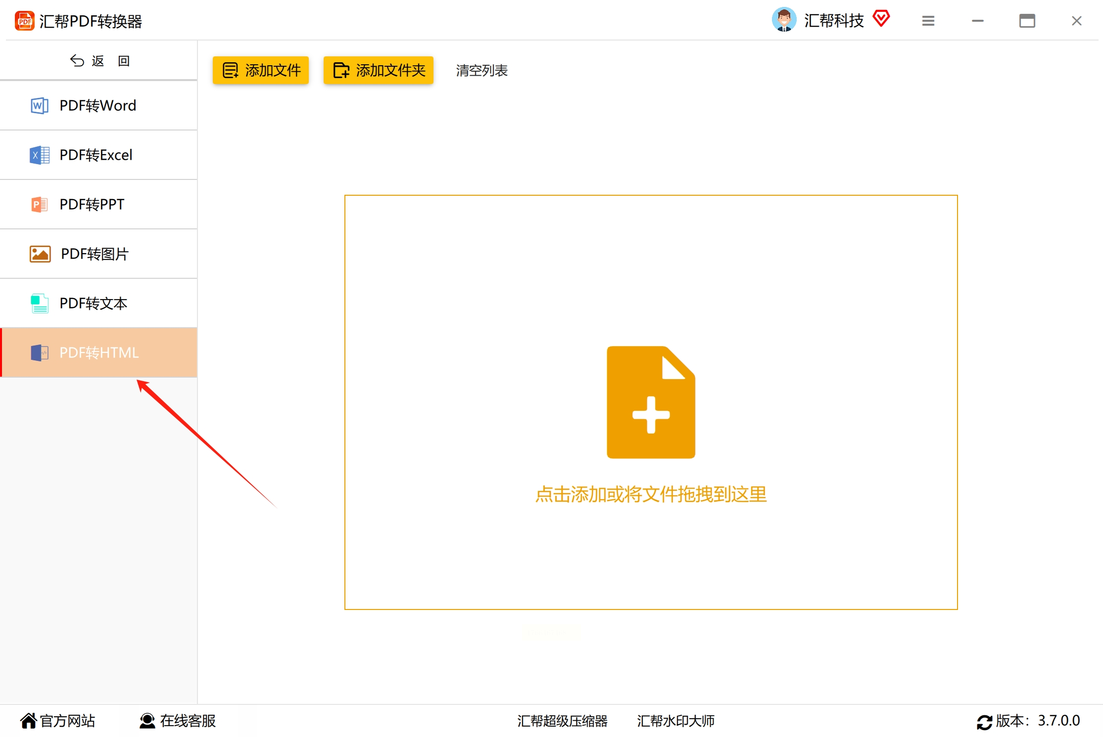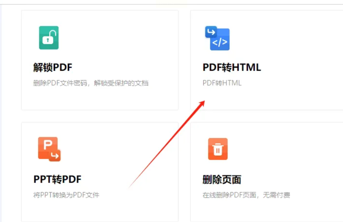 找到“PDF转文件”功能入口,点击进入后,在左侧列表中选择“PDF转HTML”选项。