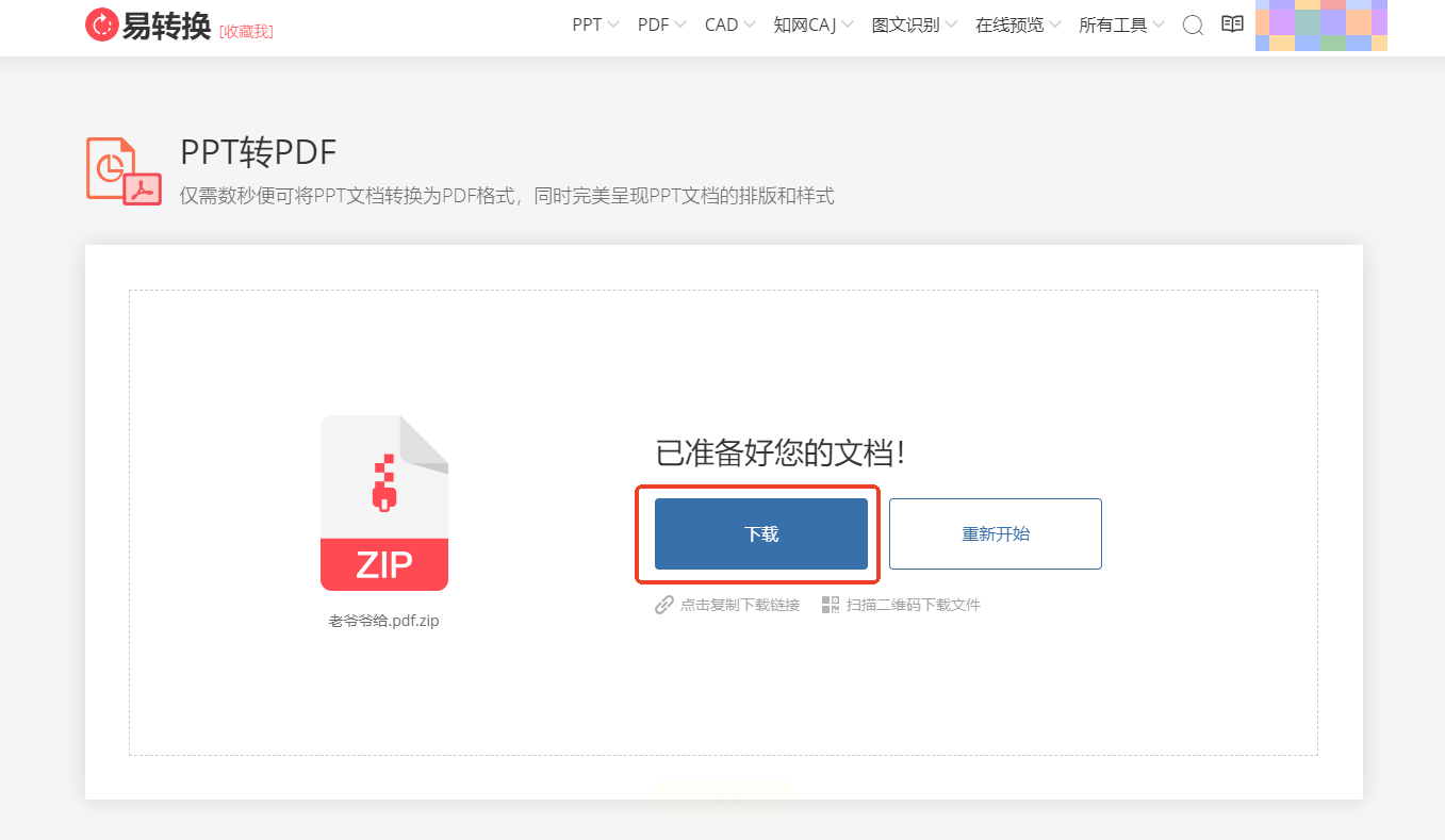 5. 转换完成后,点击"下载"按钮即可获取生成的PDF文件。