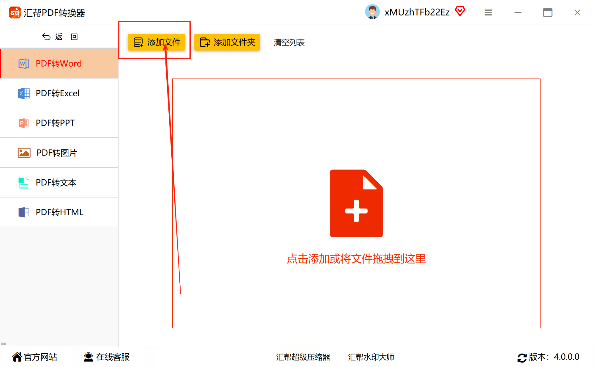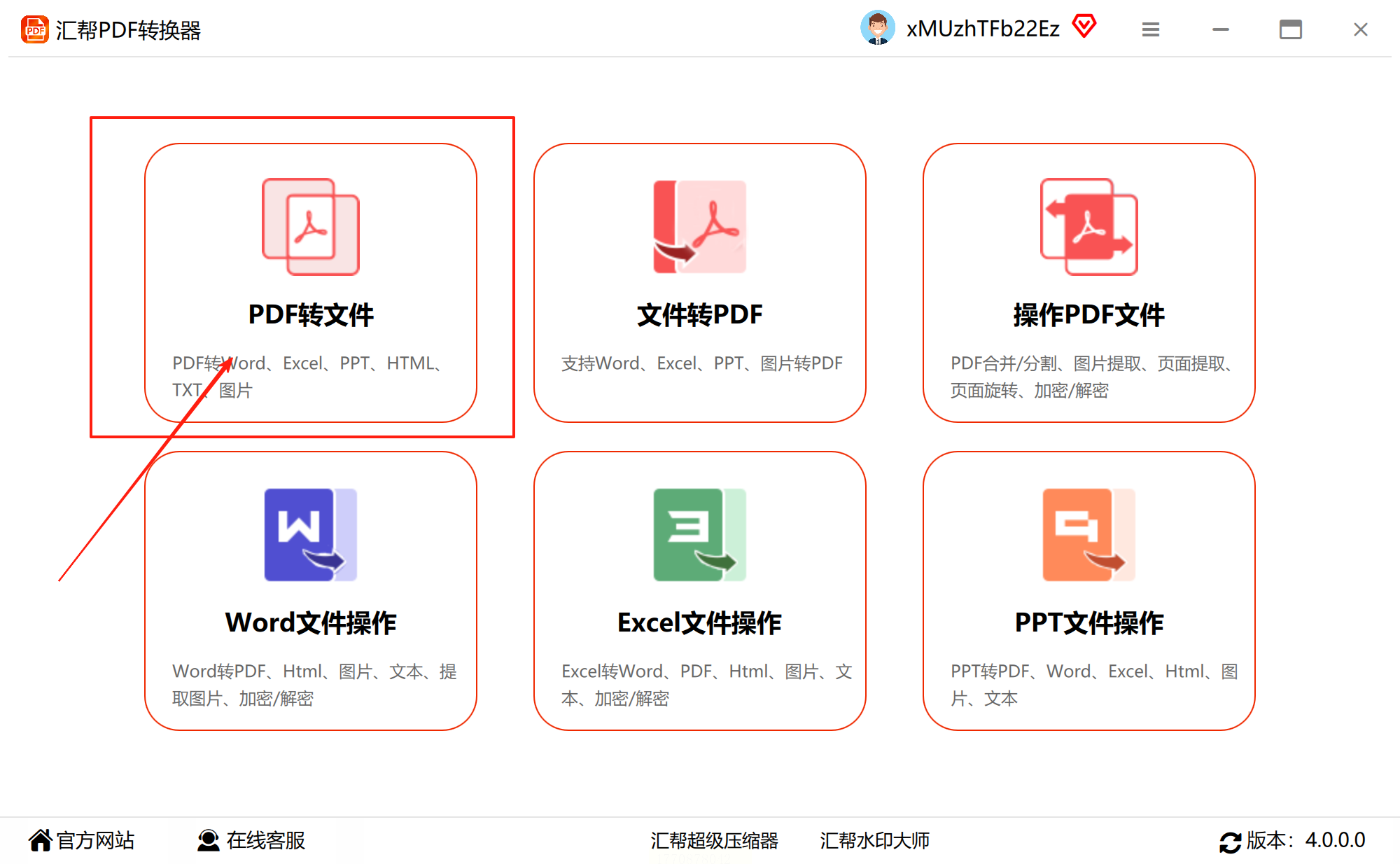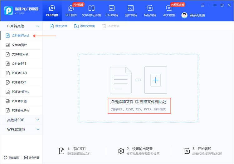 1. 打开软件,主界面上能看到“PDF转文件”的功能区,这里可以选择PDF转Word、Excel、PPT等多种格式,直接点击“PDF转Word”即可进入转换界面。