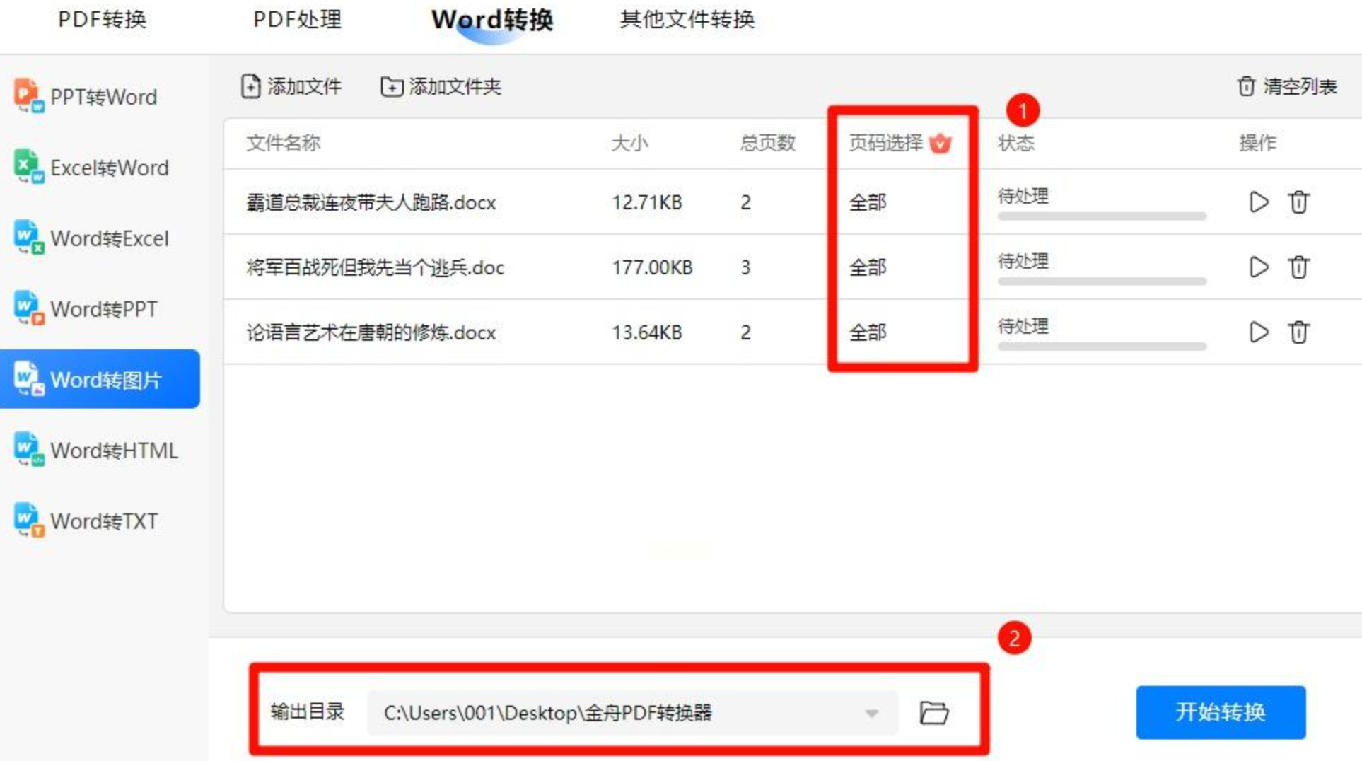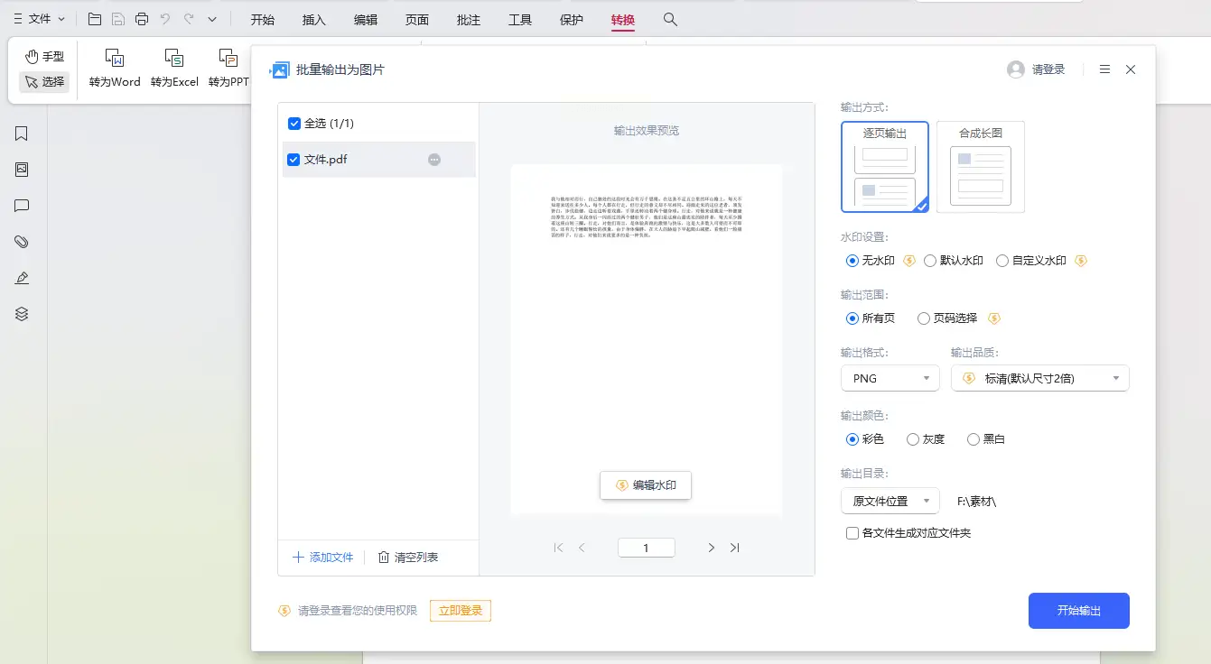 2. 选择图片格式(JPG/PNG)、分辨率、输出范围,点击“开始转换”