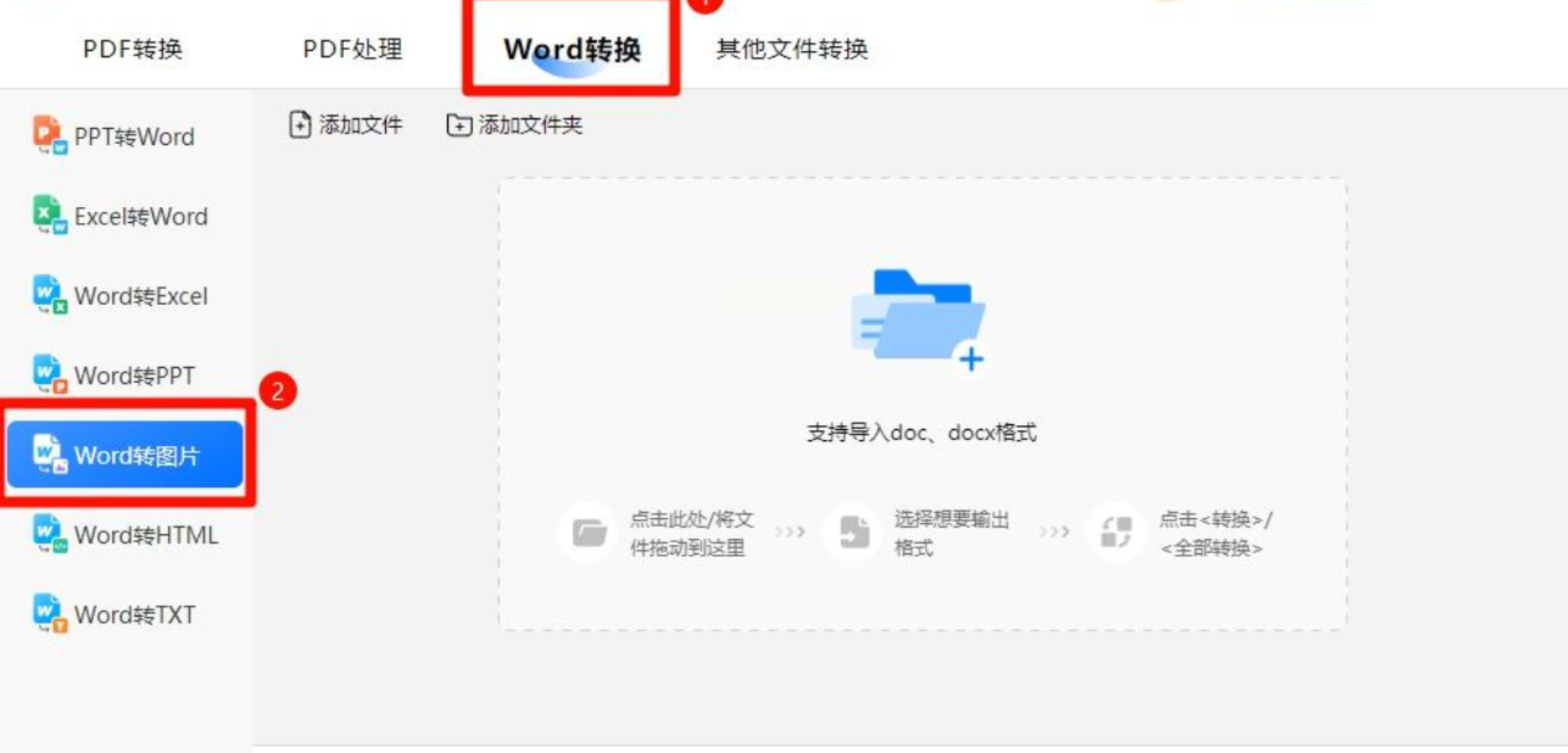 在软件主界面选择“Word转图片”专项功能,左侧菜单同时提供“Word转PDF”“Word转HTML”等选项,方便后续多格式处理。