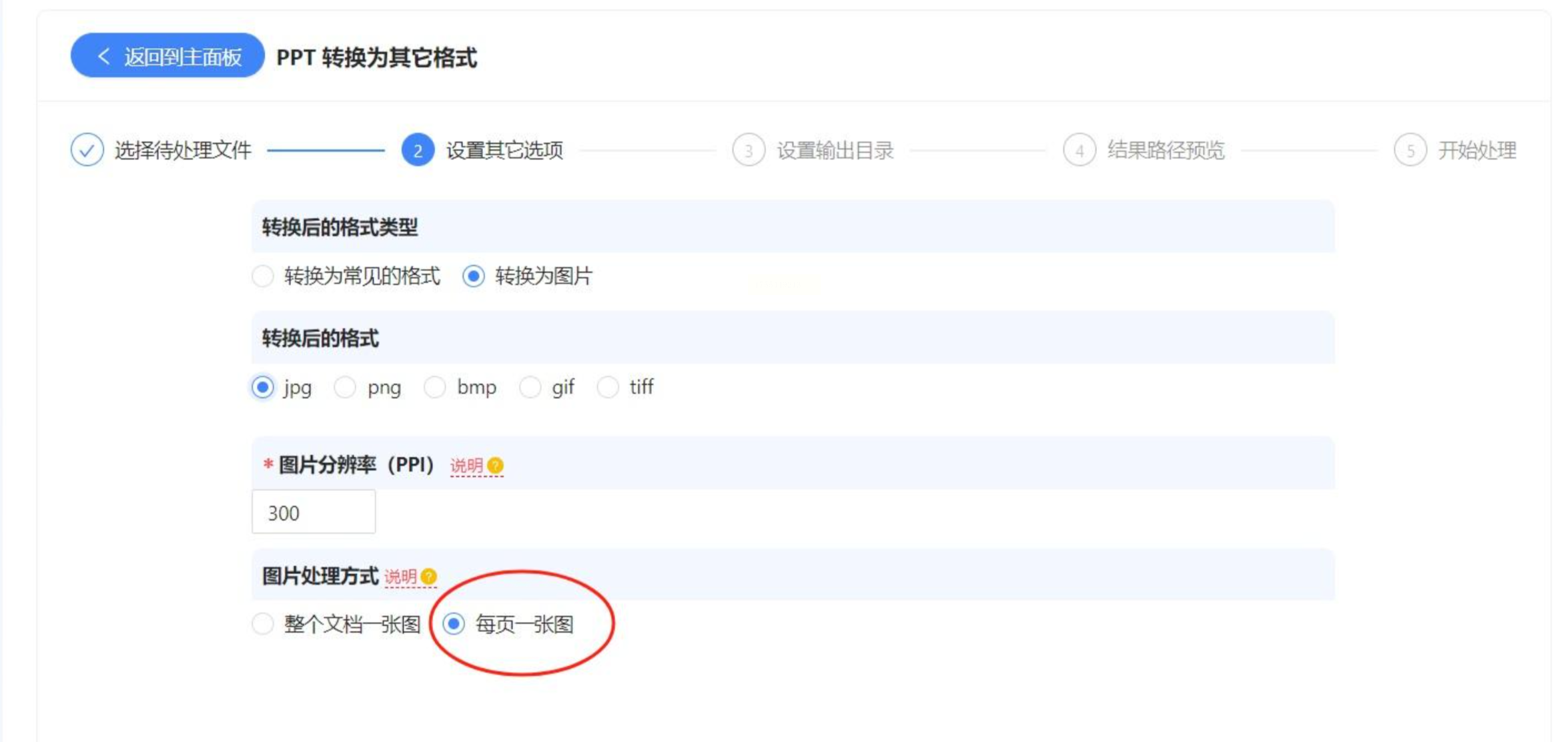 3. 设置转换选项: 选择转换格式为 JPG 或 PNG,选择“将PPT文档每一页生成一张图片”。