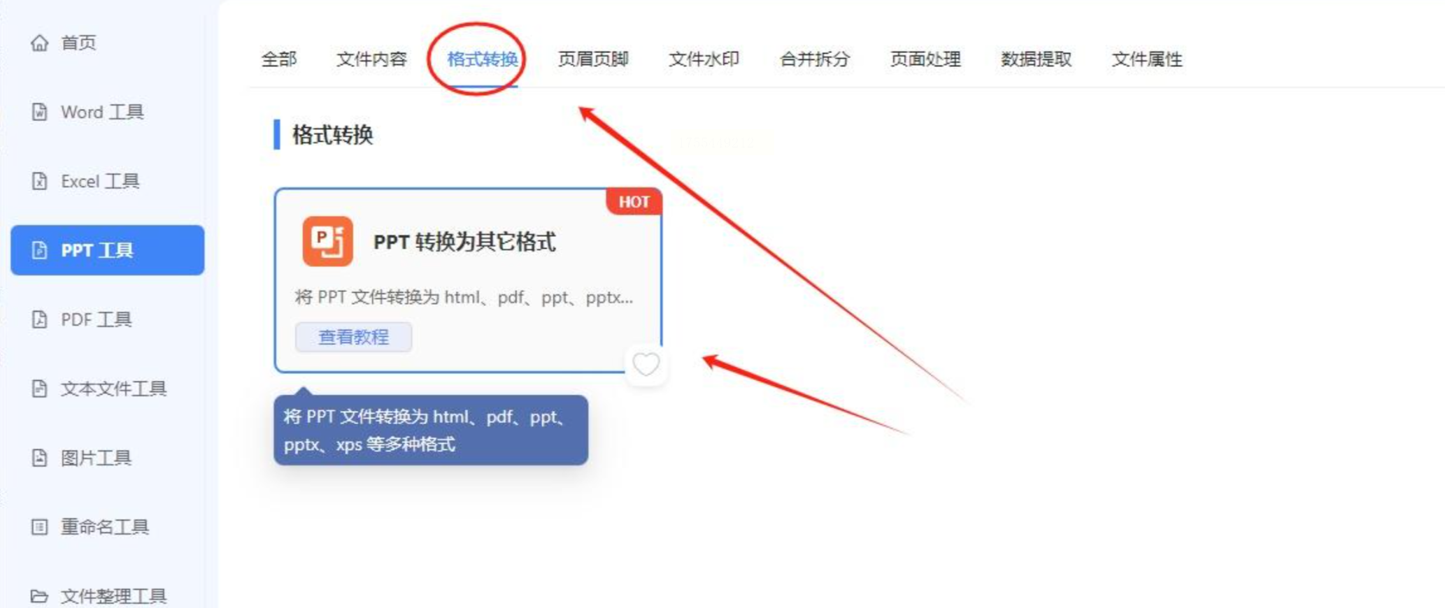 1. 打开工具箱: 打开「鹰迅批量处理工具箱」,选择「PPT工具」->“格式转换”。