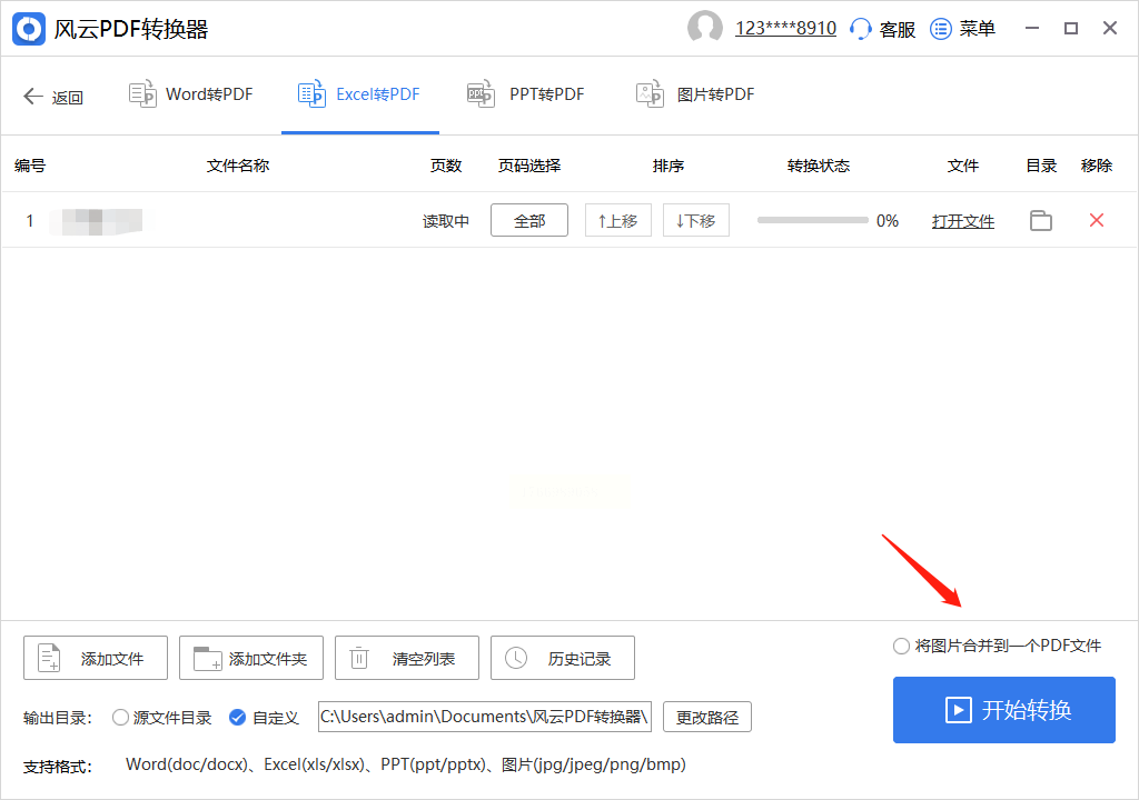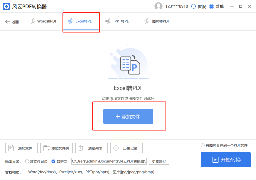 打开风云PDF转换器,选择“文件转换PDF”功能,点击“添加文档”导入Excel文件,设置输出路径后点击“开始转换”,生成PDF格式文件。