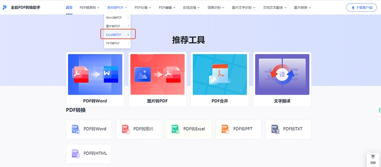 打开浏览器,进入全能PDF转换助手官网,首页找到“Excel转PDF”工具入口。