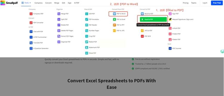 Smallpdf是国外知名的在线工具,功能全面且界面友好,Excel转Word需通过PDF中转: