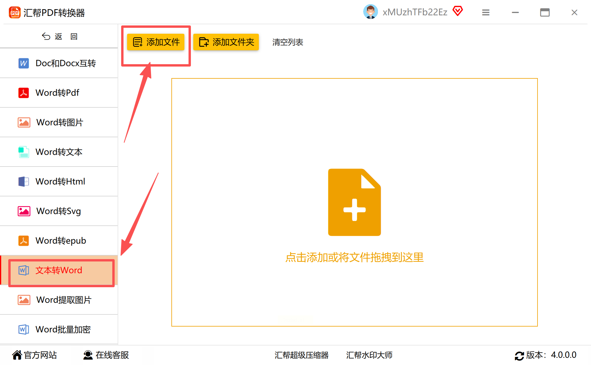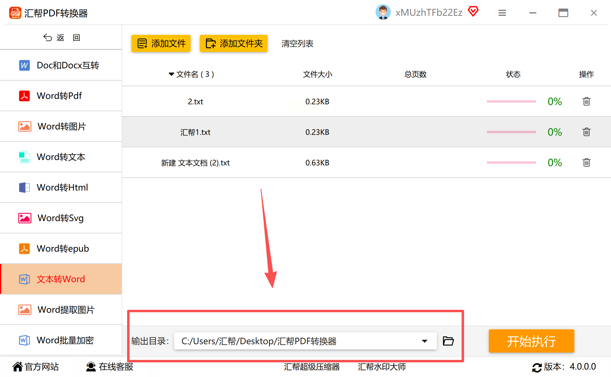 打开《汇帮PDF转换器》,在主界面左侧的功能菜单中,找到“文本转Word”选项并点击。该模块支持多种输入格式,包括文本文件(.txt)、PDF、图片等,满足不同来源的文本需求。
