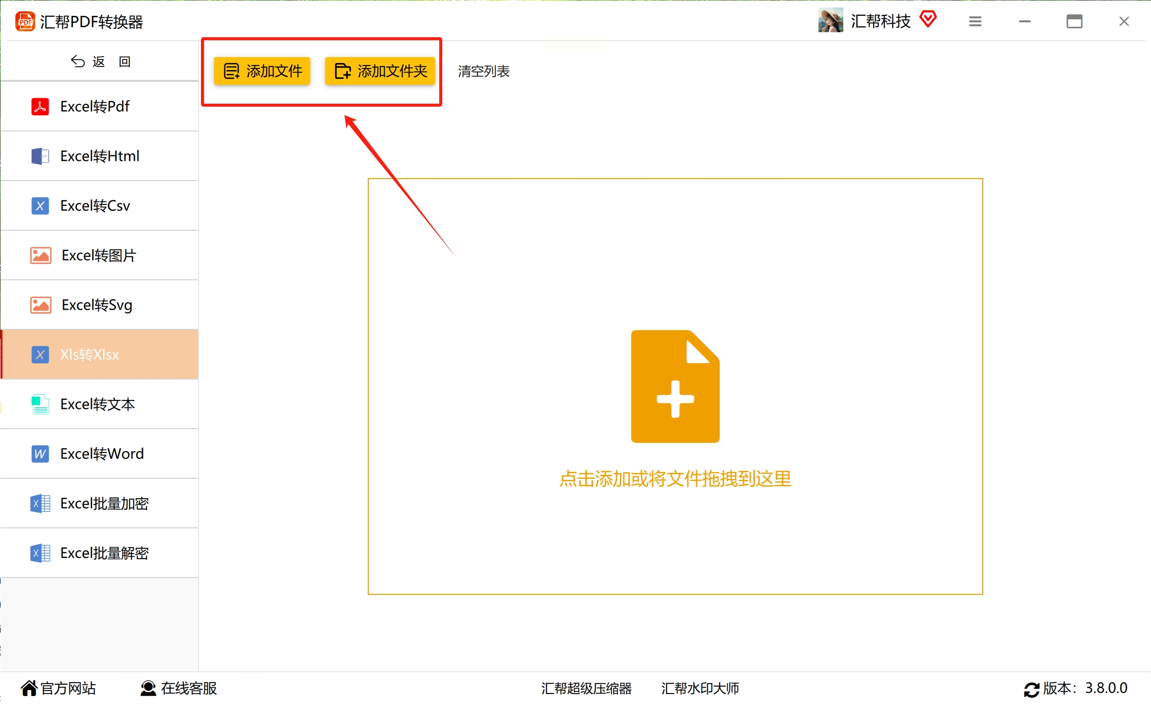 3. 添加需要转换的文件:点击左上角的"添加文件"按钮,弹出文件选择窗口。这里特别提醒:如果需要批量转换,可以直接点击"添加文件夹"按钮,选择包含xls文件的整个文件夹,系统会自动识别所有xls文件。