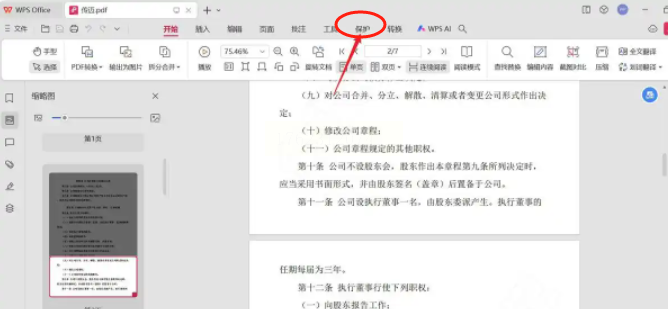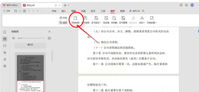 2. 点击顶部菜单栏的"保护"选项卡,这里面有多种文档保护功能,我们要找的"文档加密"就在里面。