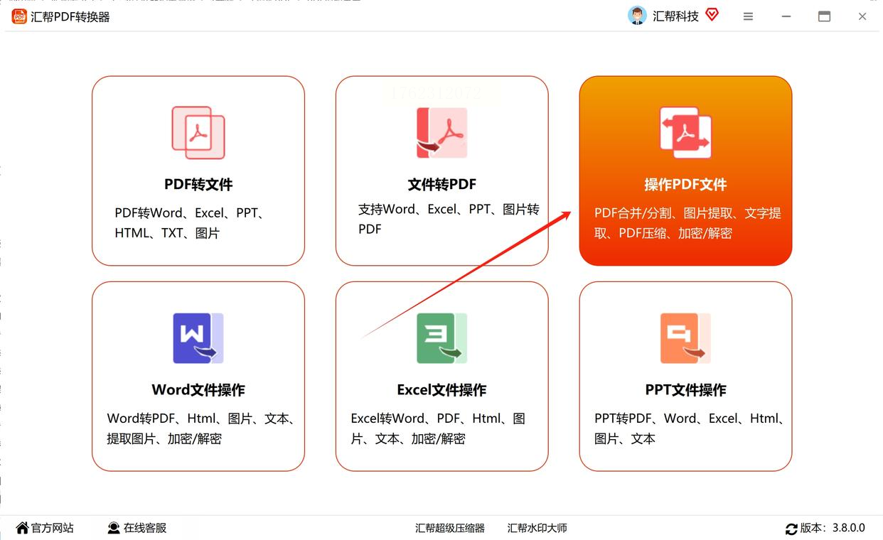 1. 打开软件后,在主界面找到"操作PDF文件"模块,点击进入。这里能看到提取图片、分割页面等多种功能,我们要找的"PDF加密"就在这个区域里。