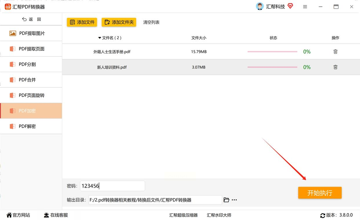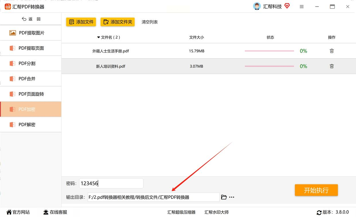 5. 最后点击右下角的"开始执行",稍等几秒就能完成加密。加密成功后,系统会自动弹出提示,打开加密后的PDF时,就需要输入密码才能查看内容了。