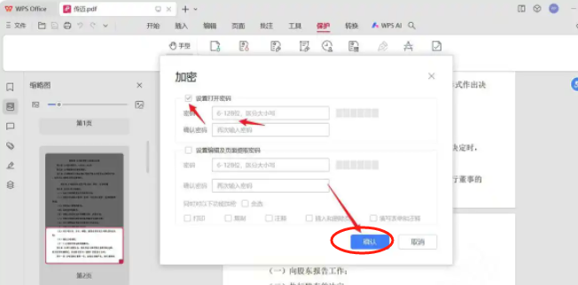 4. 在密码设置框中输入密码,建议勾选"打开密码"和"修改密码"(如果需要限制修改权限),然后点击"开始加密"。