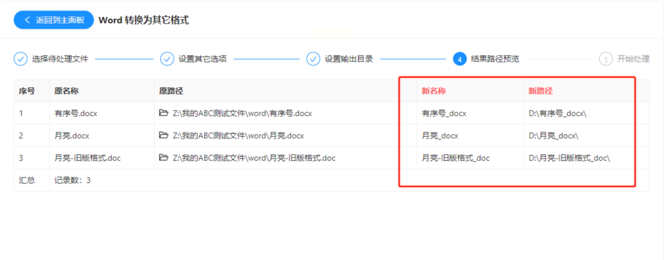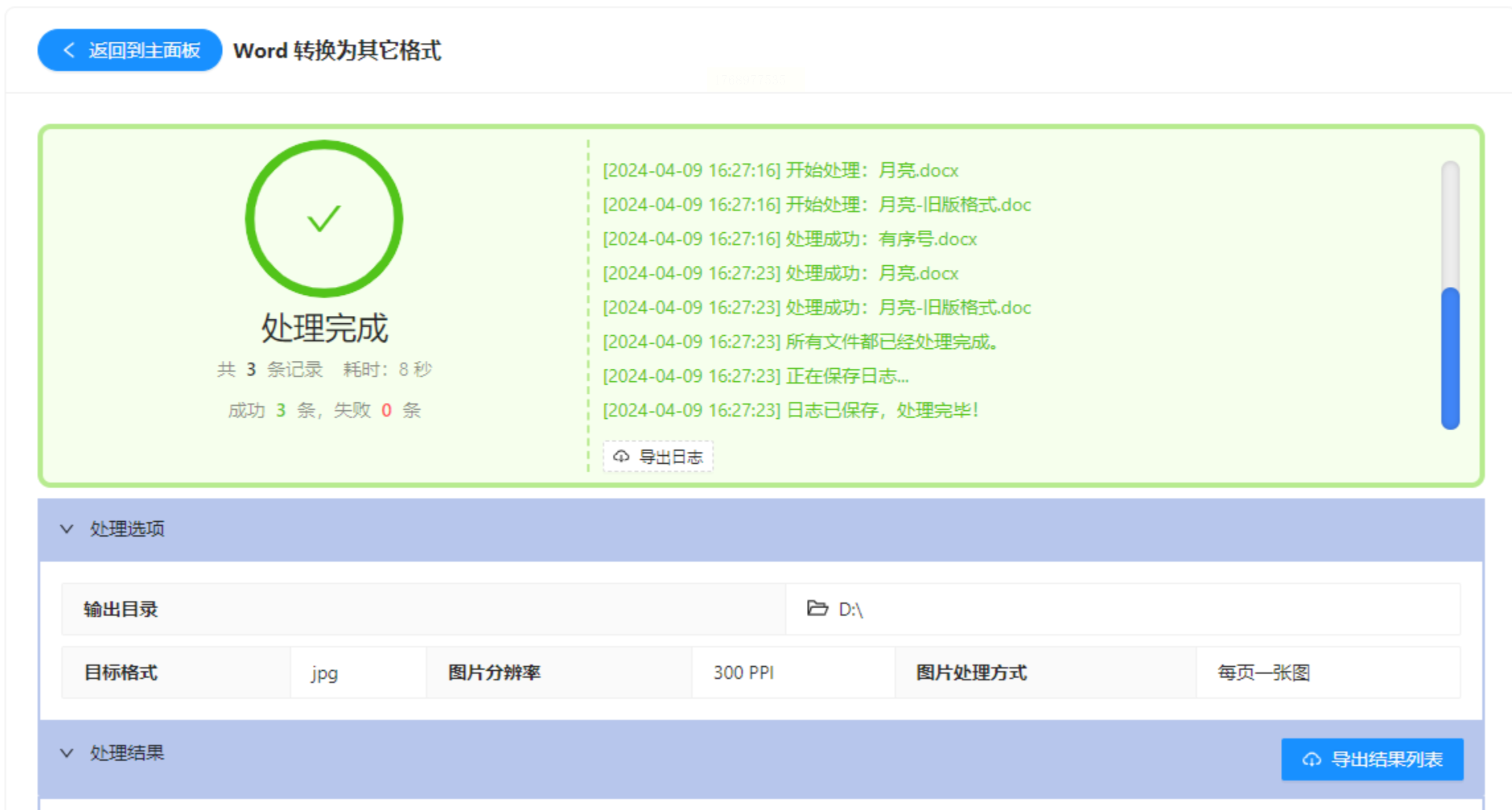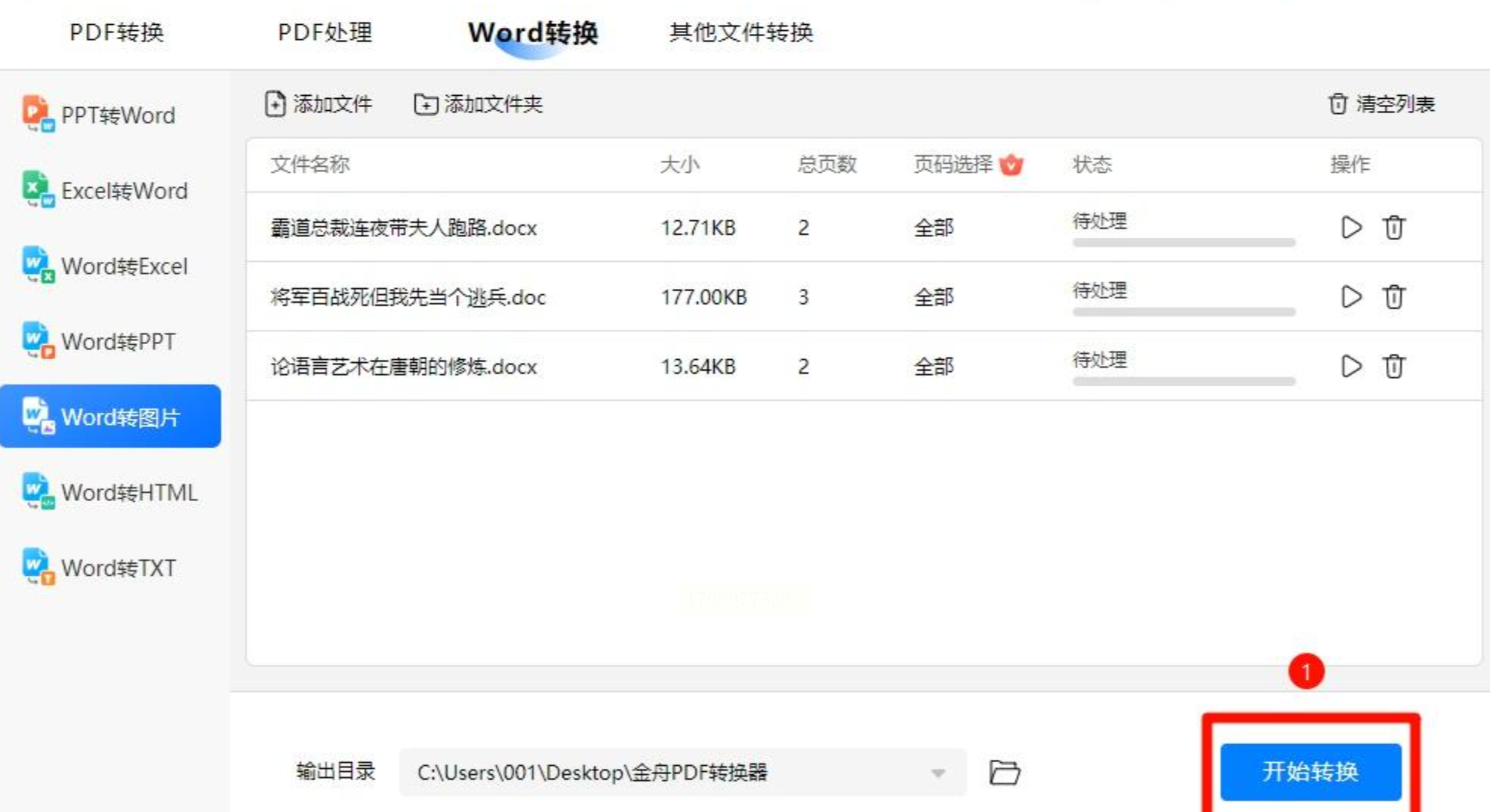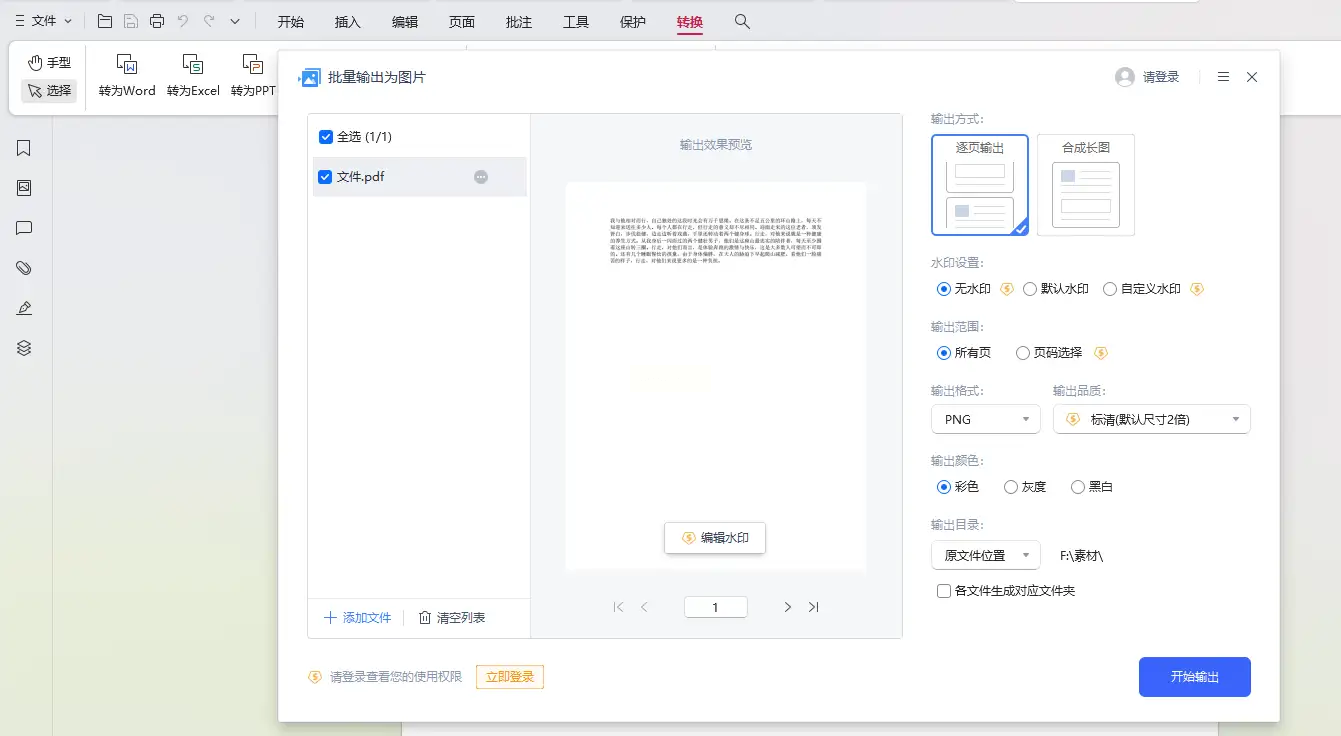 4. 快速导出:设置输出目录后,点击“开始转换”,软件会自动生成与原文档同名的图片文件。