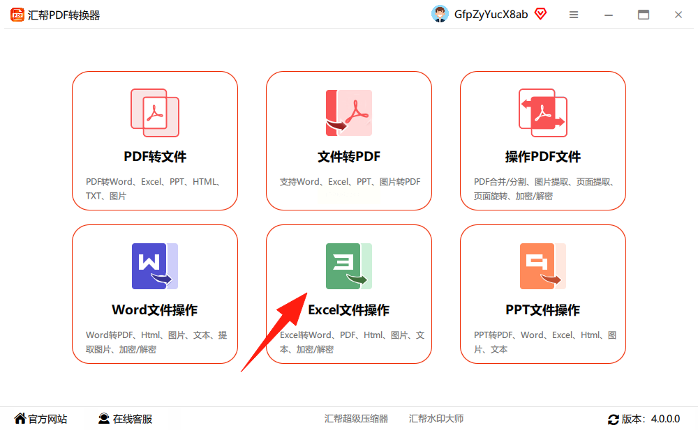 在主界面选择“Excel文件操作”,与汇帮PDF转换器类似,支持批量上传文件。