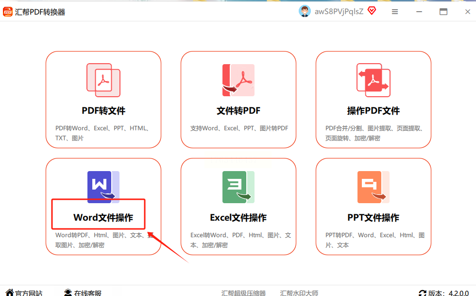 1. 打开软件选功能:先找到桌面上的《汇帮PDF转换器》图标双击打开。看到主界面左边有个“Word文件操作”模块吗?