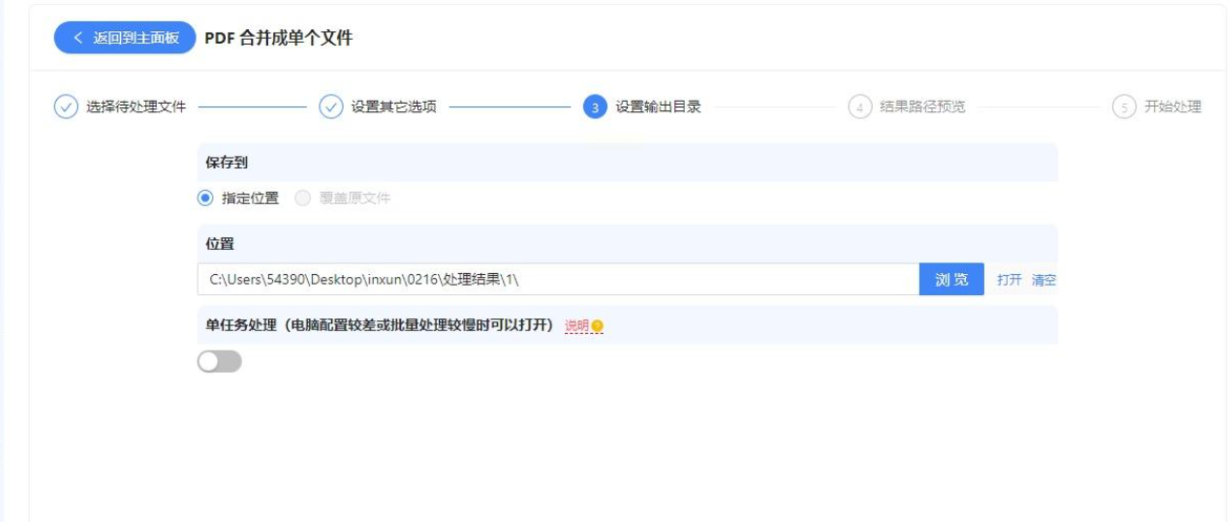在界面下方的“输出设置”区域,可手动设置合并后文件的保存路径(如D盘/工作文档/PDF合并结果),也可使用软件默认路径。建议创建独立文件夹分类存储,便于后续查找。