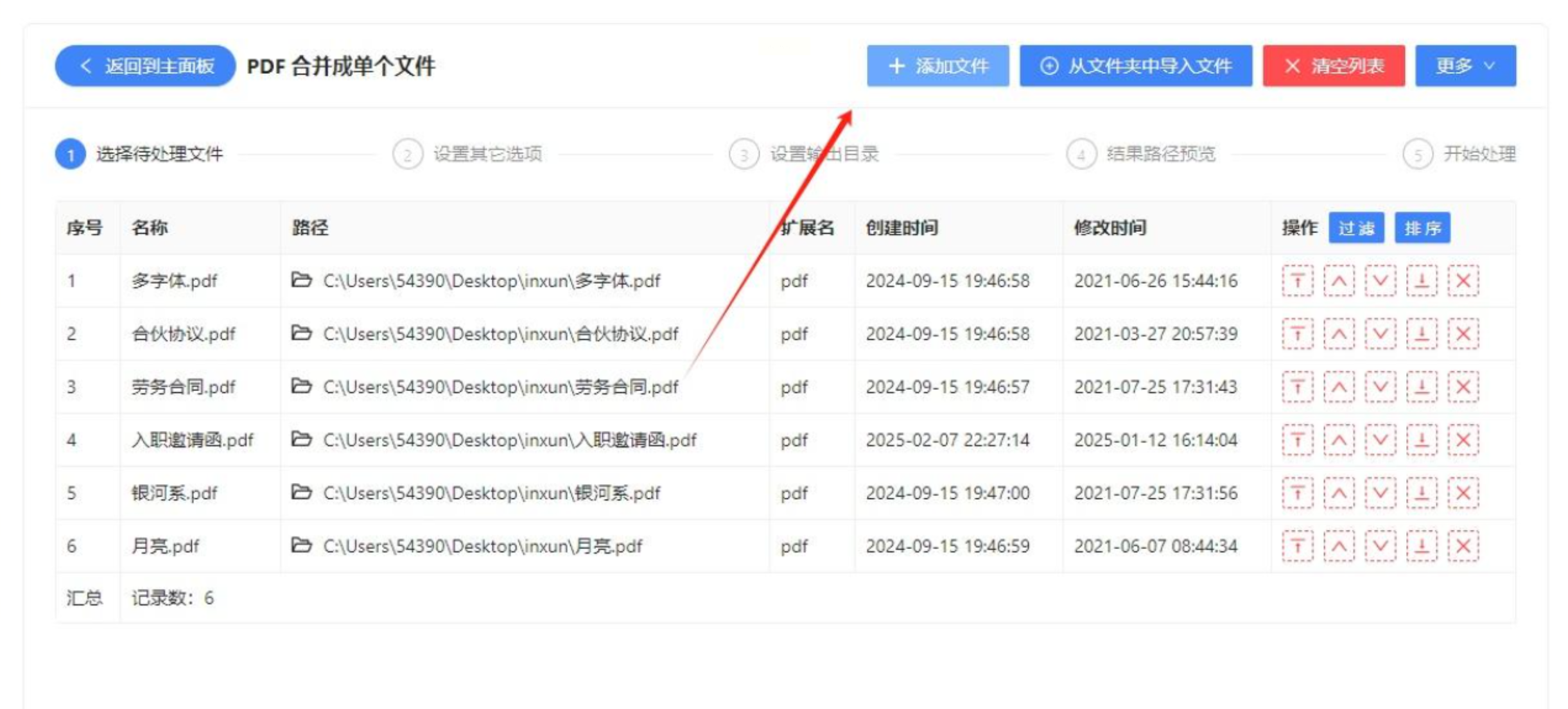 在弹出的合并窗口中,点击“添加文件”按钮,可多选多个PDF文件。添加后,文件列表会按添加顺序排列,支持通过上下箭头调整合并顺序。若需反向排序,右键菜单提供“全部上移”“全部下移”选项。
