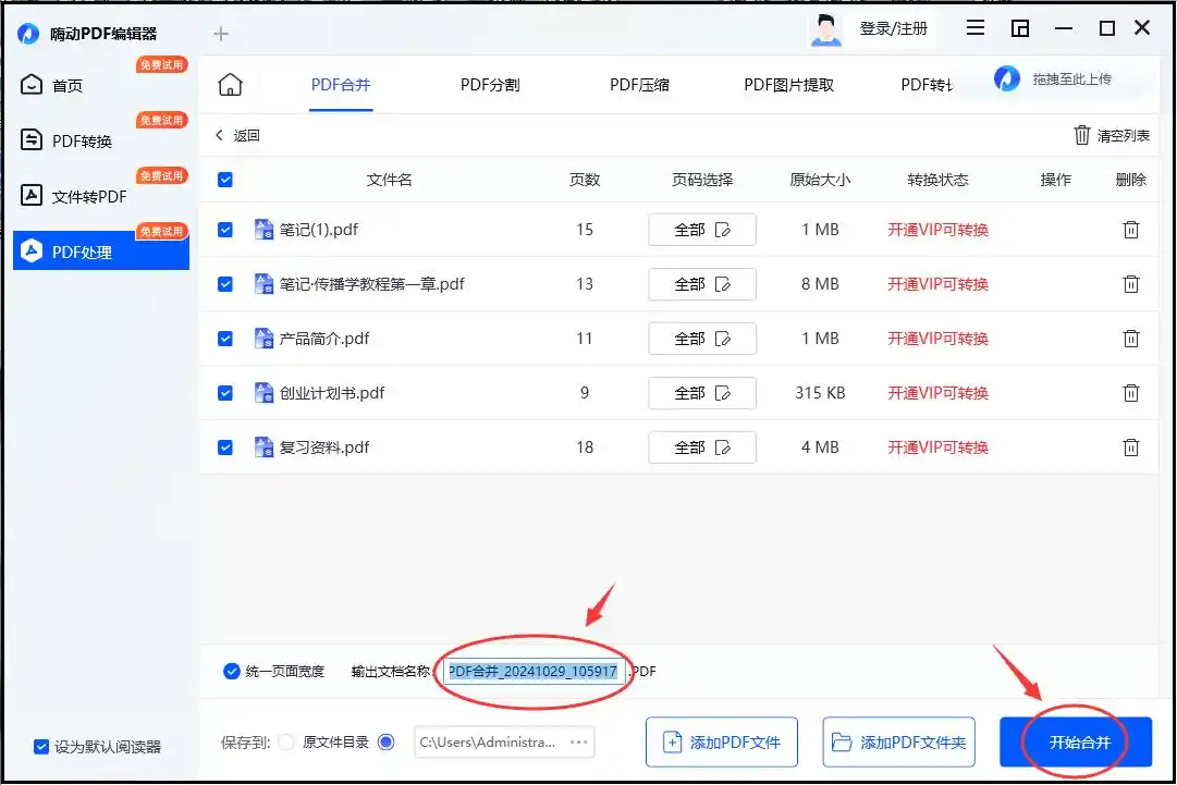 在“合并设置”区域,可直接修改输出文件名(默认与首个文件同名),也可选择“自动命名”(如“合并_20230915”)。路径设置与其他工具一致,支持自定义保存位置。