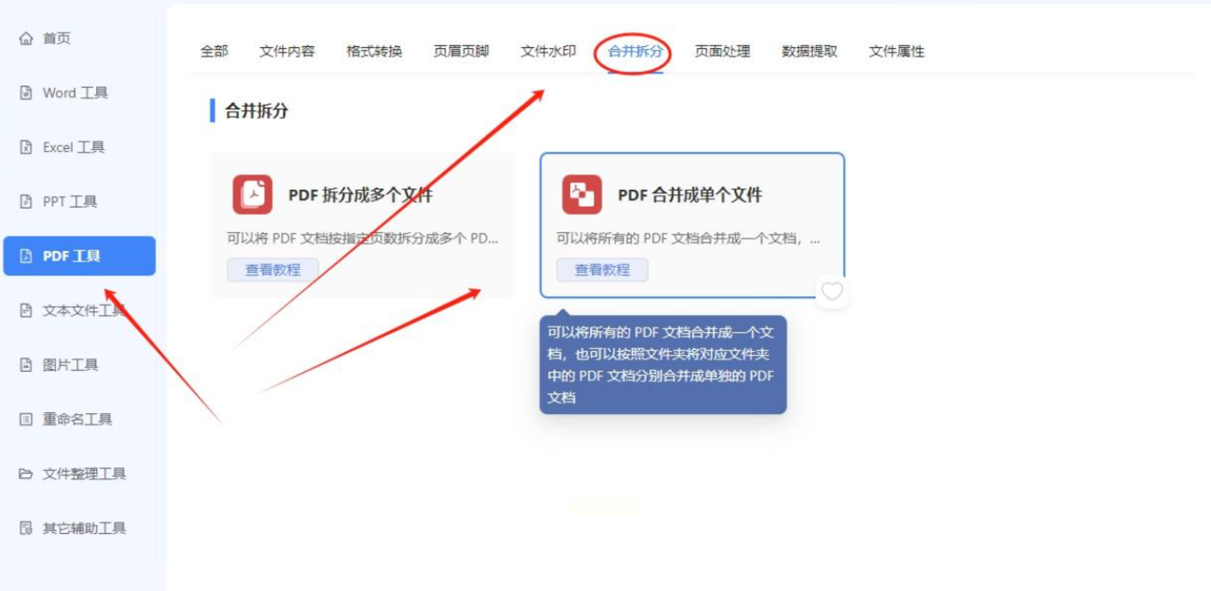 2. 点击左上角「PDF工具」→「合并文档」(或在「文件」菜单中直接选择「拆分合并」)。