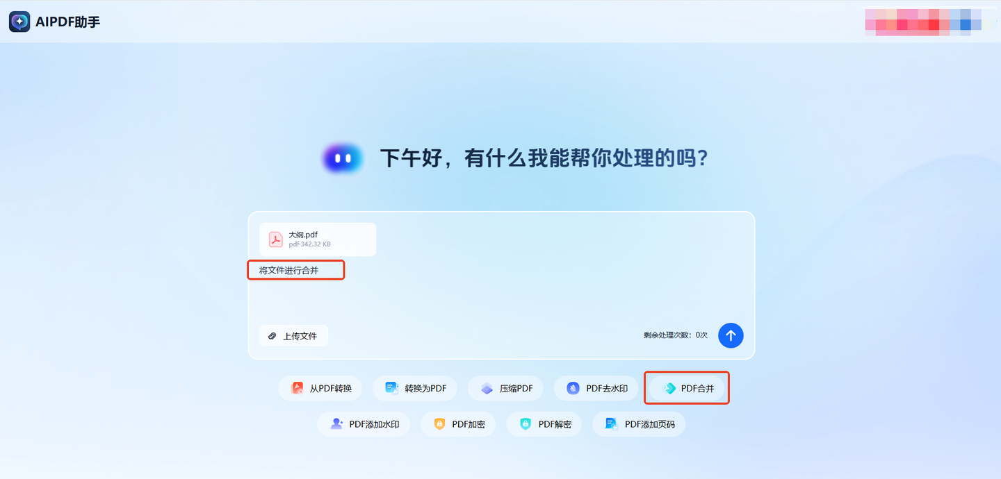 2. 选择「合并PDF」功能,点击「选择文件」上传单个或多个PDF。