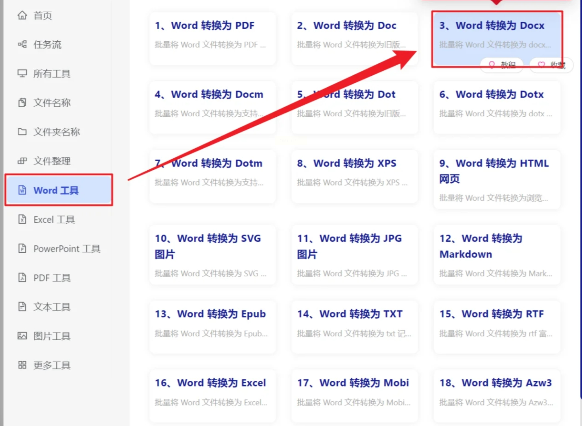 3. 选中转换功能:在左侧的功能列表里,第一个通常就是 【doc转docx】,点击选中它。