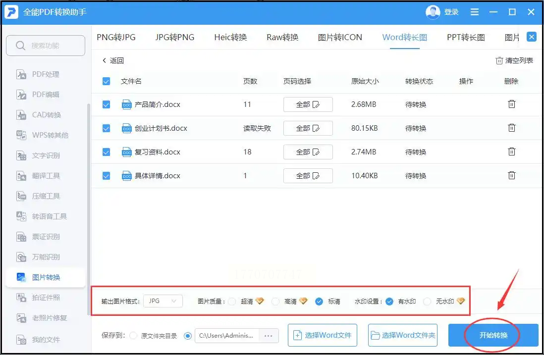 步骤三:上传完成后,在右侧的转换选项中选择“Word转图片”。如果文档内容较长,想把所有页面拼接成一张长图,可以勾选“拼接成长图”选项;如果需要单独页面,就不用勾选。