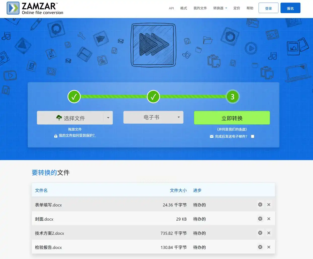 1. 进入转换页面:打开Zamzar官网(注意:选择无广告的稳定入口),点击页面中央“选择文件”按钮。