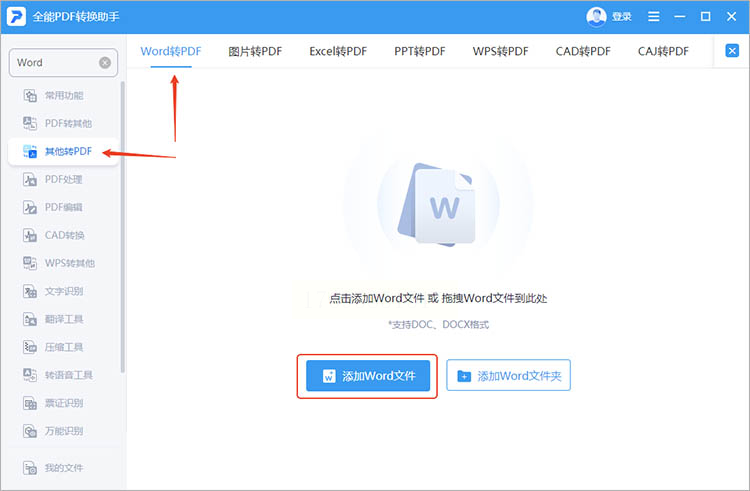 点击“添加文件”或直接拖拽Word文件到界面,支持同时导入多个不同格式的文档(如.docx、.doc等)。