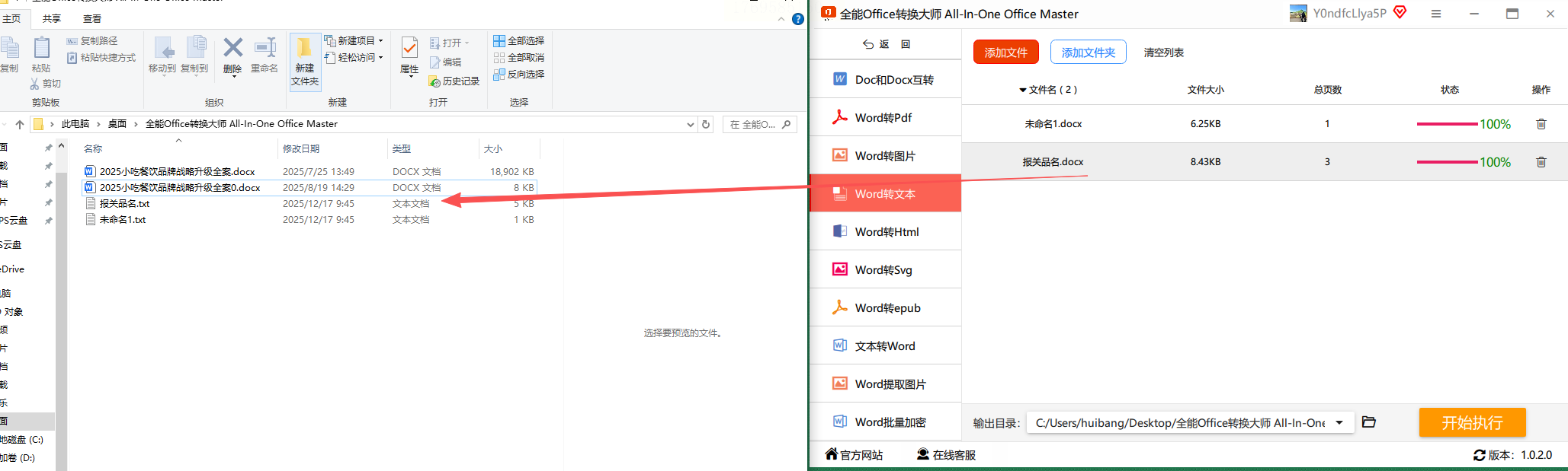 确认所有参数无误后,点击“开始执行”按钮,软件会快速完成转换。转换完成后,在指定目录中就能找到生成的TXT文件,原Word文档会自动备份,确保数据安全。