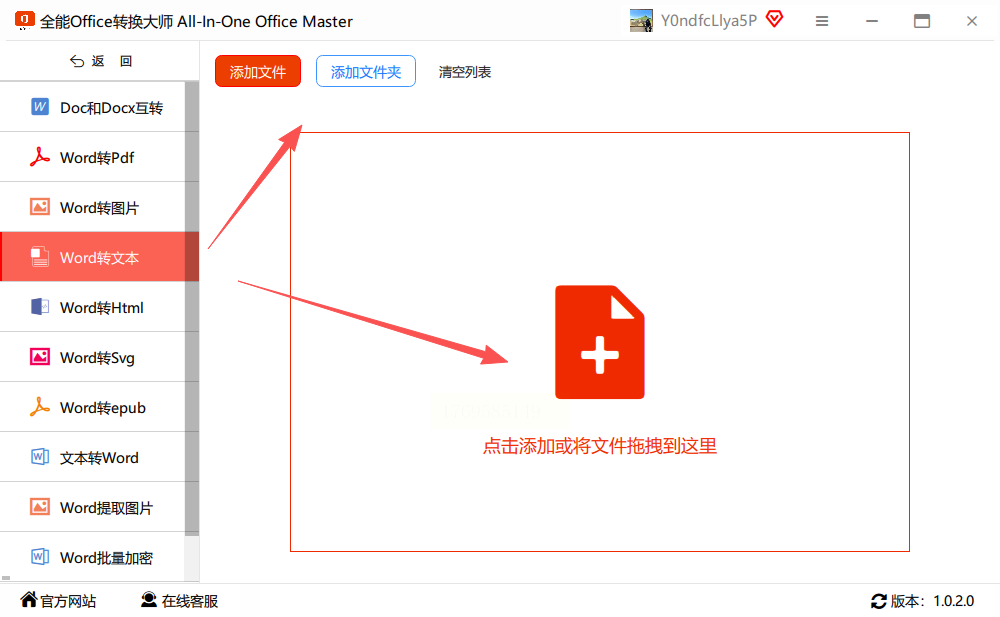 左侧功能栏中找到“Word转文本”选项,点击后界面右侧会出现文件上传区域,支持直接拖拽Word文件到指定位置,也能通过“添加文件”按钮批量导入多个文档。