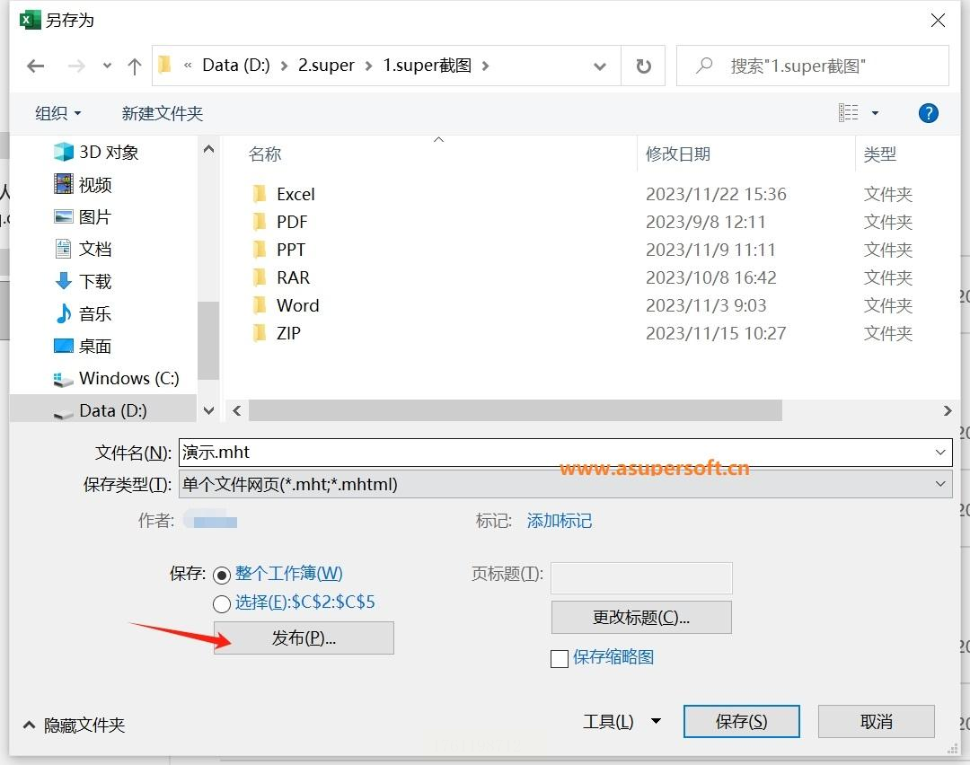 步骤二:在保存类型中选择“单个文件网页”,注意不要直接点击保存,而要点击下方的“发布”按钮。