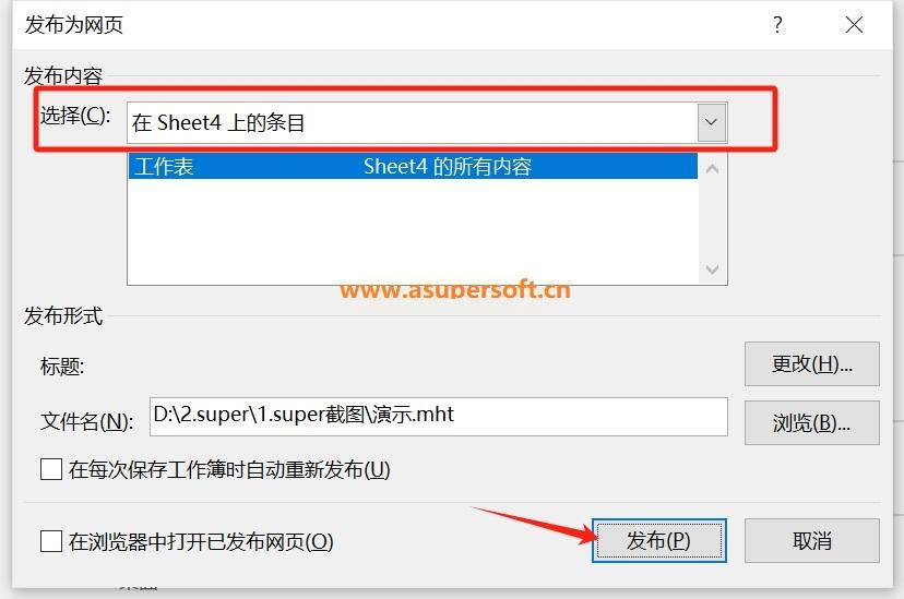 步骤三:在弹出的发布窗口中,选择要转换的工作表区域,勾选“在浏览器中打开已发布的网页”选项,然后点击“发布”。