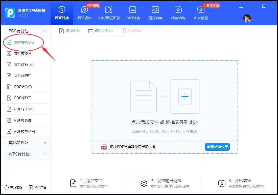 步骤一:启动软件后,在功能导航栏找到“文件转Word”或类似的主功能。