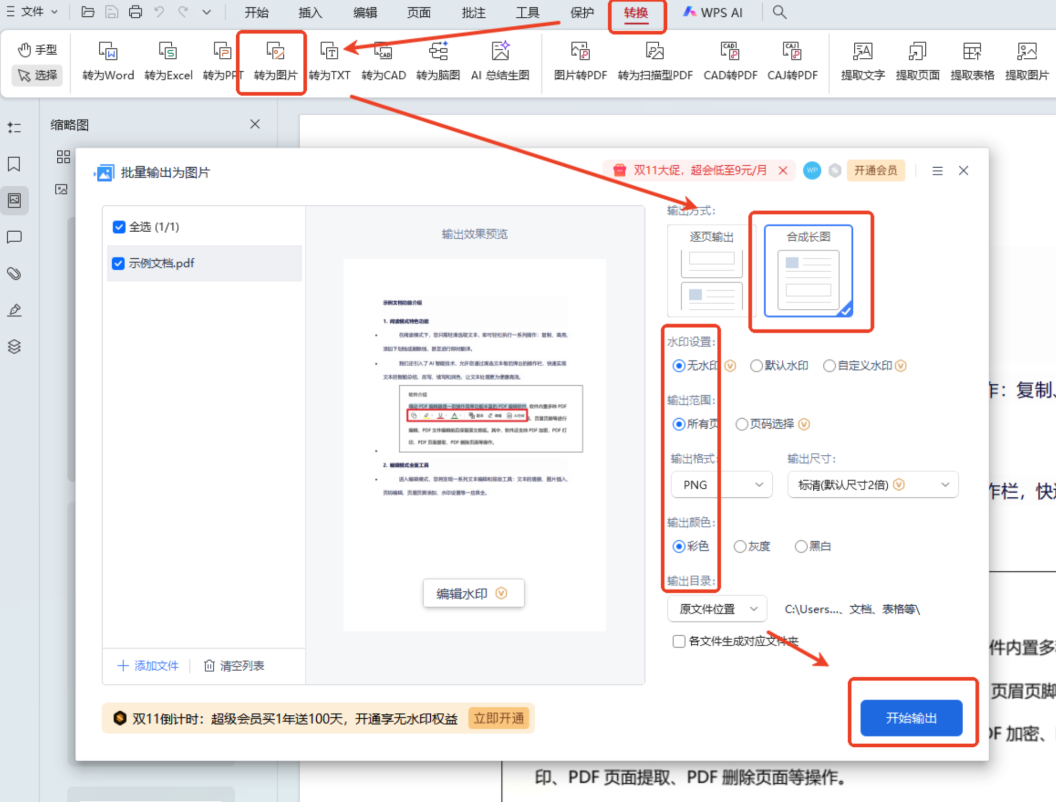 点击“开始输出”按钮,WPS将自动把PDF所有页面合并为一张长图片。转换完成后,图片会保存至指定位置。